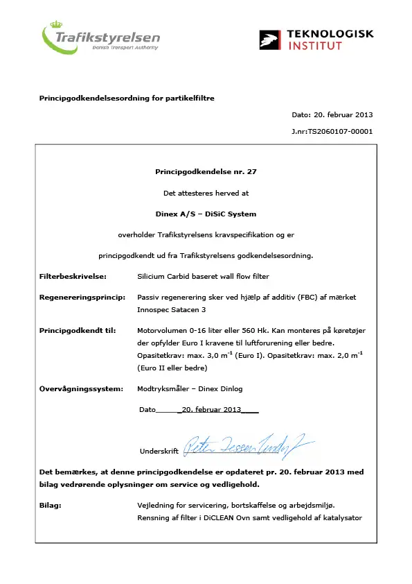 Principgodkendelsesordning for partikelfiltre nr 27 - Dinex AS DiSiC System