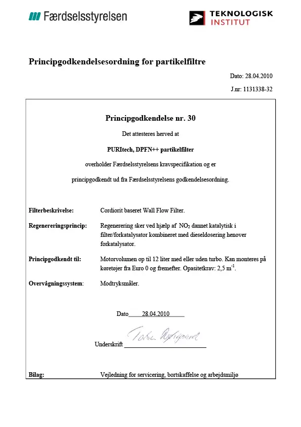 Principgodkendelsesordning for partikelfiltre nr 30 - PURItech DPFN++ partikelfilter overholder