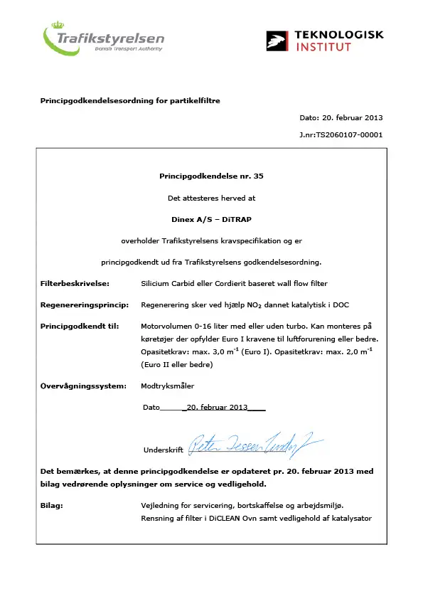 Principgodkendelsesordning for partikelfiltre nr 35 - Dinex AS DiTRA