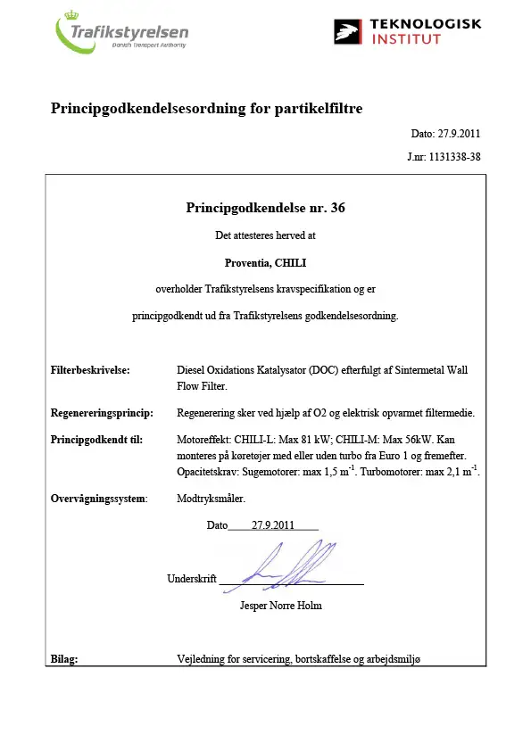Principgodkendelsesordning for partikelfiltre nr 36 - Proventia CHILI