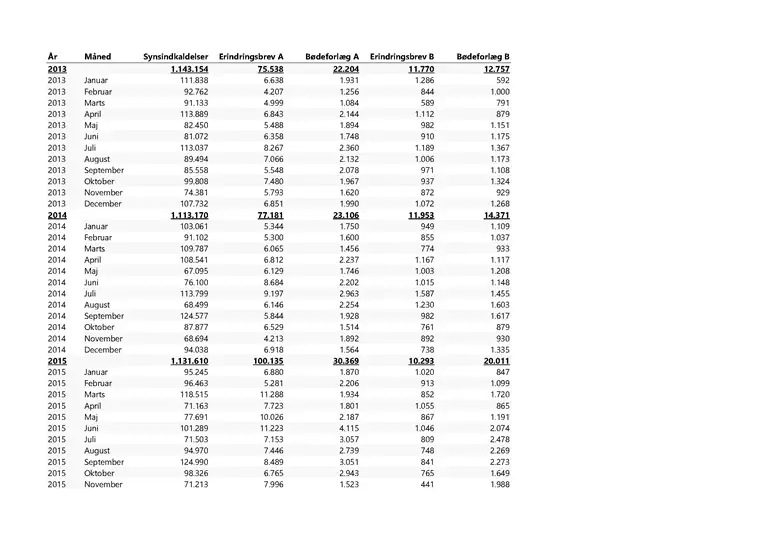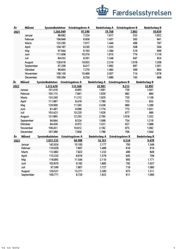 Rapport over antal synsindkaldelser, erindringer og bøder