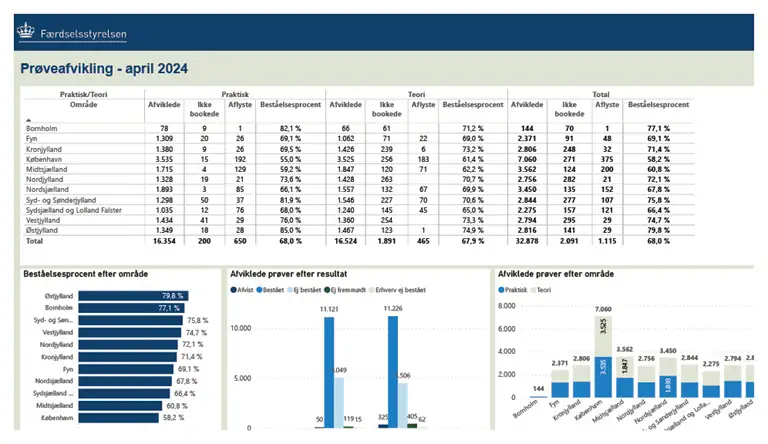 Her kan du se statistikker for hver måned over køreprøveafholdelse, geografisk, hvor mange prøver som er afholdt som planlagt, ikke fremmødt mv.