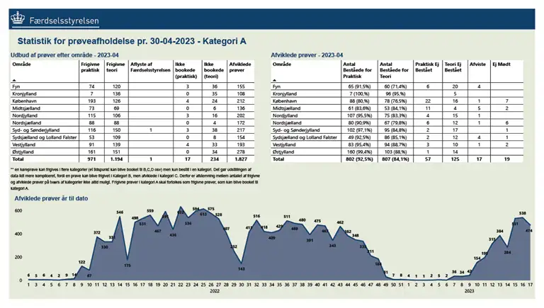 Her kan du se statistikker for hver måned over køreprøveafholdelse, geografisk, hvor mange prøver som er afholdt som planlagt, ikke fremmødt mv.