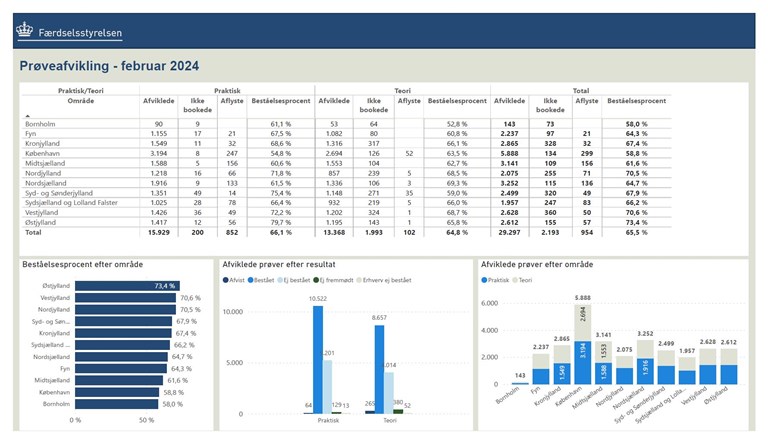Her kan du se statistikker for hver måned over køreprøveafholdelse, geografisk, hvor mange prøver som er afholdt som planlagt, ikke fremmødt mv.