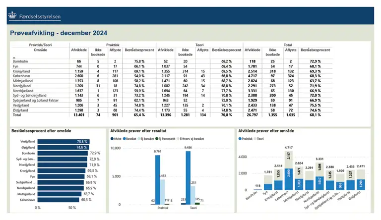 Her kan du se statistikker for hver måned over køreprøveafholdelse, geografisk, hvor mange prøver som er afholdt som planlagt, ikke fremmødt mv.