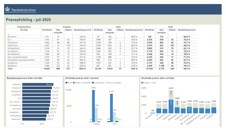 Her kan du se statistikker for hver måned over køreprøveafholdelse, geografisk, hvor mange prøver som er afholdt som planlagt, ikke fremmødt mv.