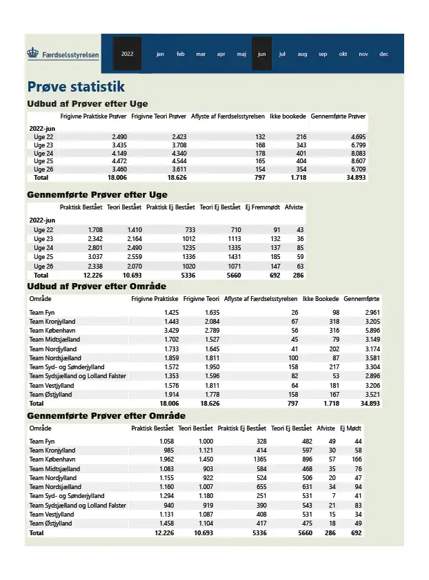 Her kan du se statistikker for hver måned over køreprøveafholdelse, geografisk, hvor mange prøver som er afholdt som planlagt, ikke fremmødt mv.