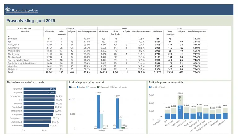 Her kan du se statistikker for hver måned over køreprøveafholdelse, geografisk, hvor mange prøver som er afholdt som planlagt, ikke fremmødt mv.