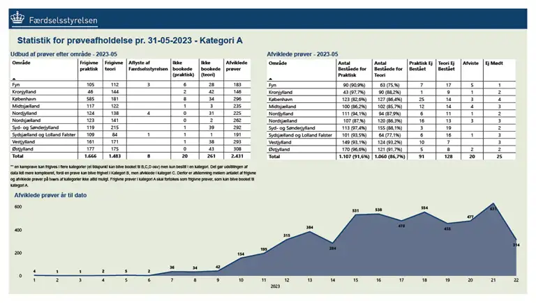 Her kan du se statistikker for hver måned over køreprøveafholdelse, geografisk, hvor mange prøver som er afholdt som planlagt, ikke fremmødt mv.
