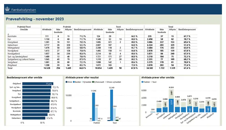 Her kan du se statistikker for hver måned over køreprøveafholdelse, geografisk, hvor mange prøver som er afholdt som planlagt, ikke fremmødt mv.