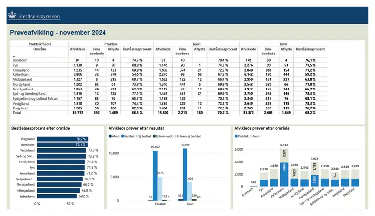 Her kan du se statistikker for hver måned over køreprøveafholdelse, geografisk, hvor mange prøver som er afholdt som planlagt, ikke fremmødt mv.