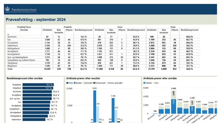 Her kan du se statistikker for hver måned over køreprøveafholdelse, geografisk, hvor mange prøver som er afholdt som planlagt, ikke fremmødt mv.