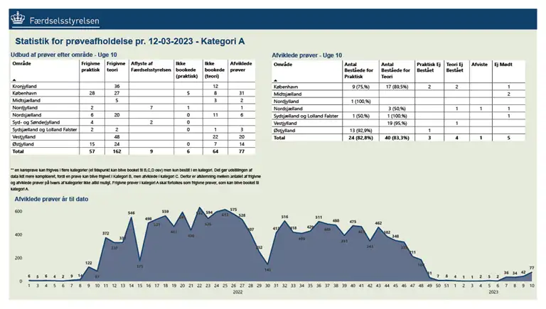 Her kan du se statistikker for hver måned over køreprøveafholdelse, geografisk, hvor mange prøver som er afholdt som planlagt, ikke fremmødt mv.