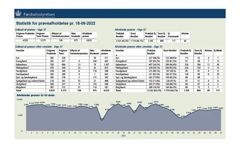 Her kan du se statistikker for hver måned over køreprøveafholdelse, geografisk, hvor mange prøver som er afholdt som planlagt, ikke fremmødt mv.