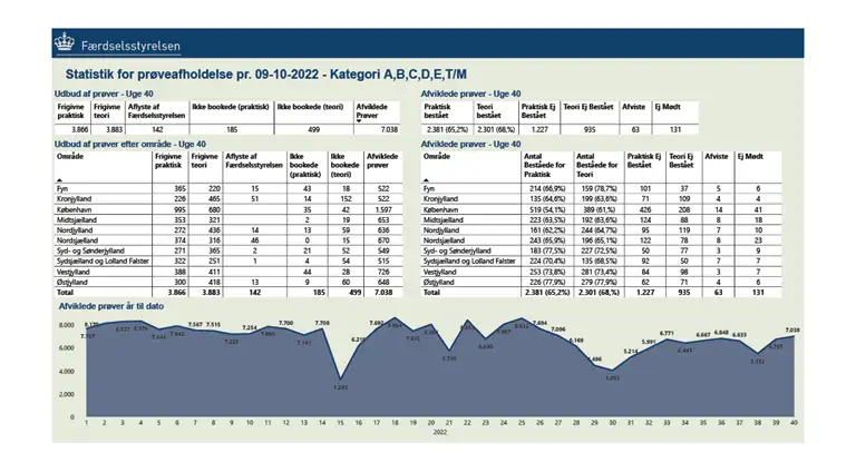 Her kan du se statistikker for hver måned over køreprøveafholdelse, geografisk, hvor mange prøver som er afholdt som planlagt, ikke fremmødt mv.