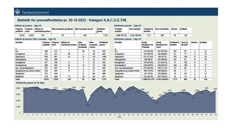 Her kan du se statistikker for hver måned over køreprøveafholdelse, geografisk, hvor mange prøver som er afholdt som planlagt, ikke fremmødt mv.