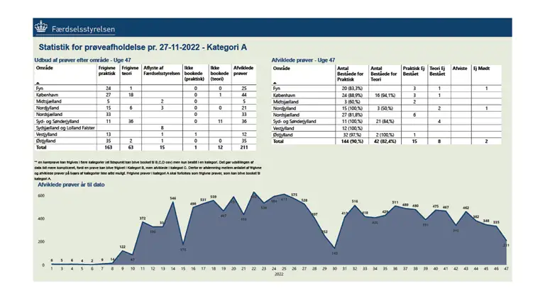 Her kan du se statistikker for hver måned over køreprøveafholdelse, geografisk, hvor mange prøver som er afholdt som planlagt, ikke fremmødt mv.