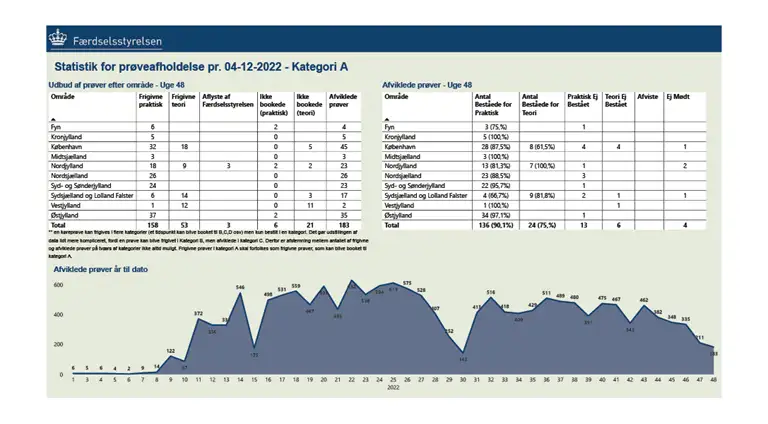 Her kan du se statistikker for hver måned over køreprøveafholdelse, geografisk, hvor mange prøver som er afholdt som planlagt, ikke fremmødt mv.
