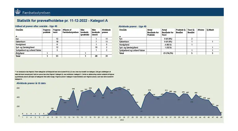 Her kan du se statistikker for hver måned over køreprøveafholdelse, geografisk, hvor mange prøver som er afholdt som planlagt, ikke fremmødt mv.