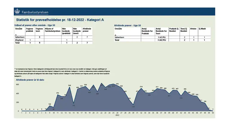 Her kan du se statistikker for hver måned over køreprøveafholdelse, geografisk, hvor mange prøver som er afholdt som planlagt, ikke fremmødt mv.