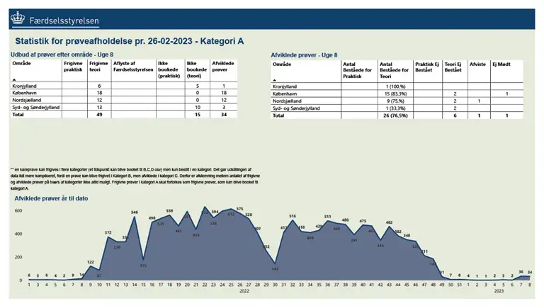 Her kan du se statistikker for hver måned over køreprøveafholdelse, geografisk, hvor mange prøver som er afholdt som planlagt, ikke fremmødt mv.
