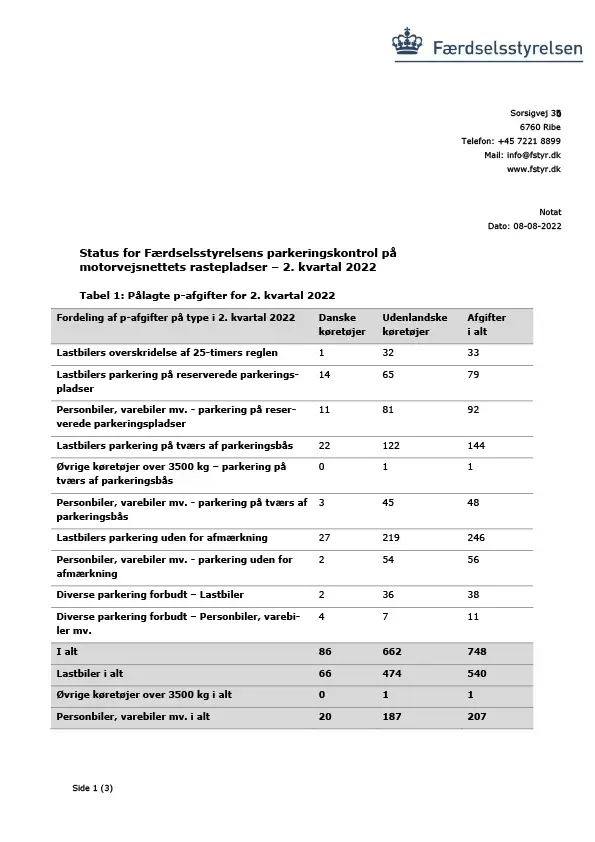 Status for Færdselsstyrelsens parkeringskontrol på rastepladser - 2 kvartal 2022