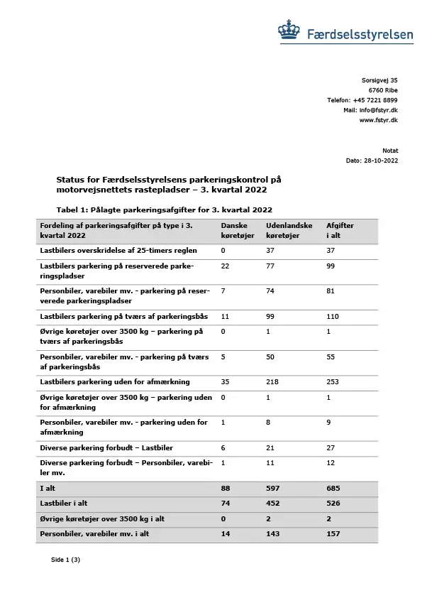 Status for Færdselsstyrelsens parkeringskontrol på rastepladser - 3 kvartal 2022