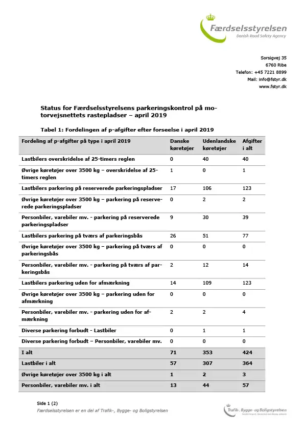 Status for Færdselsstyrelsens parkeringskontrol på rastepladser - April 2019