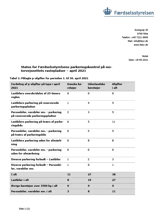 Status for Færdselsstyrelsens parkeringskontrol på rastepladser - April 2021