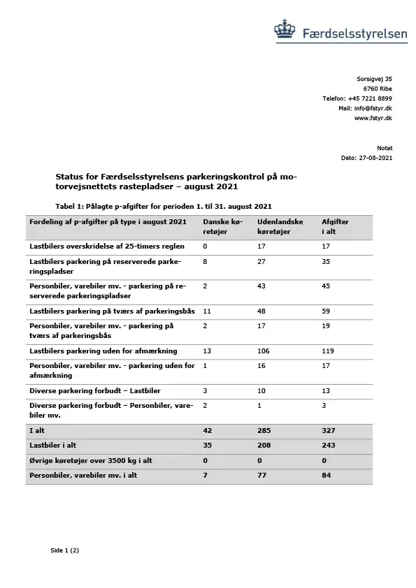 Status for Færdselsstyrelsens parkeringskontrol på rastepladser - August 2021
