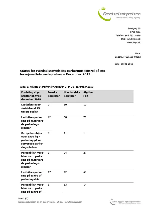 Status for Færdselsstyrelsens parkeringskontrol på rastepladser - December 2019