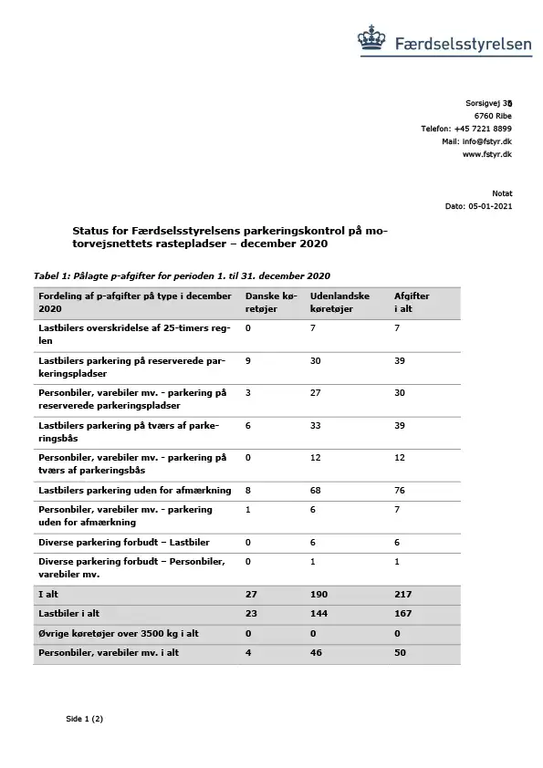 Status for Færdselsstyrelsens parkeringskontrol på rastepladser - December 2020