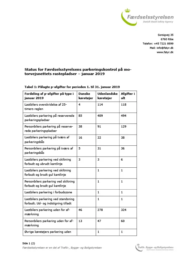 Status for Færdselsstyrelsens parkeringskontrol på rastepladser - Januar 2019