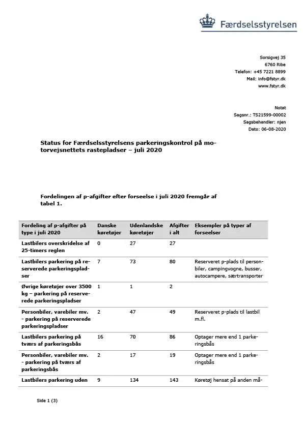 Status for Færdselsstyrelsens parkeringskontrol på rastepladser - Juli 2020
