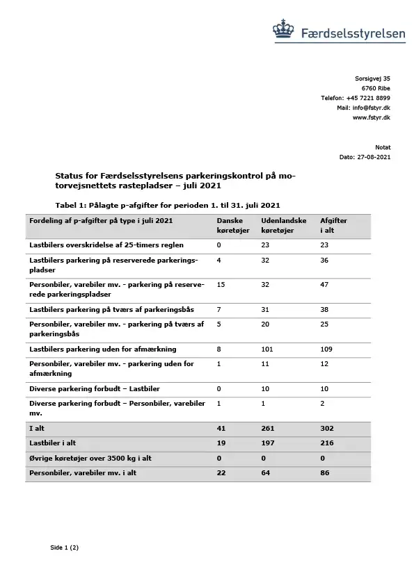 Status for Færdselsstyrelsens parkeringskontrol på rastepladser - Juli 2021