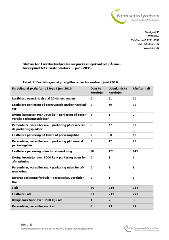 Status for Færdselsstyrelsens parkeringskontrol på rastepladser - Juni 2019