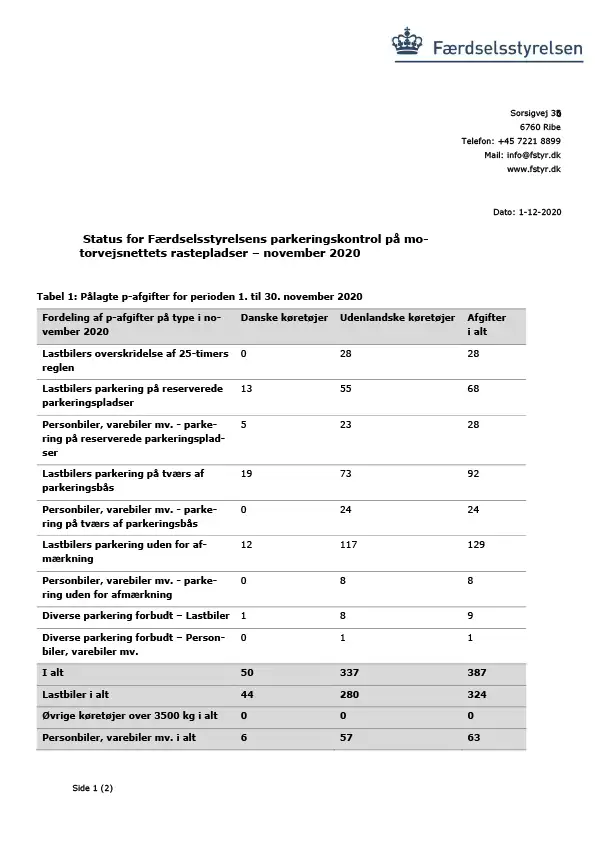 Status for Færdselsstyrelsens parkeringskontrol på rastepladser - November 2020
