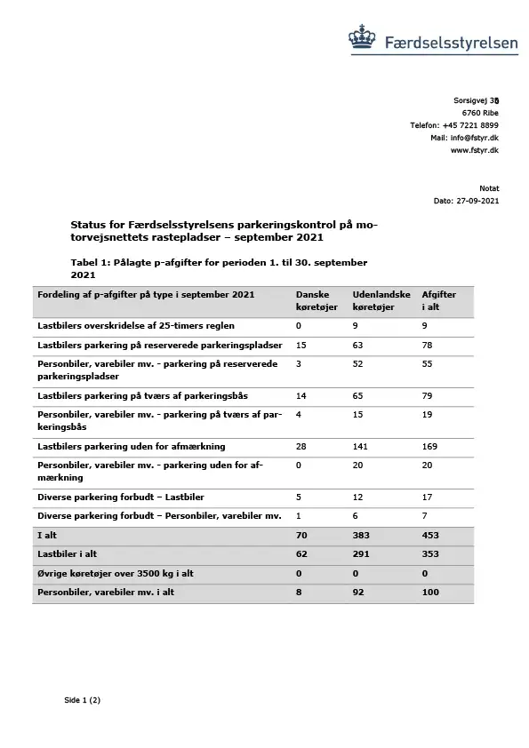 Status for Færdselsstyrelsens parkeringskontrol på rastepladser - September 2021