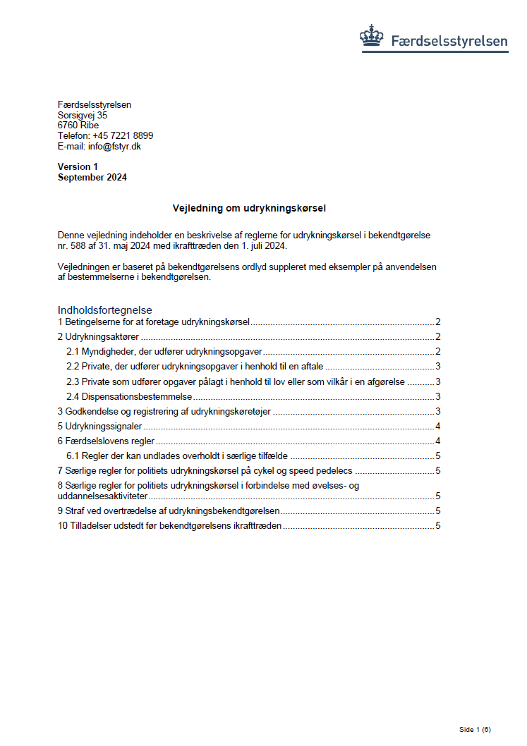 Denne vejledning indeholder en beskrivelse af reglerne for udrykningskørsel i bekendtgørelse nr. 588 af 31. maj 2024 med ikrafttræden den 1. juli 2024.